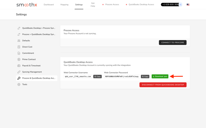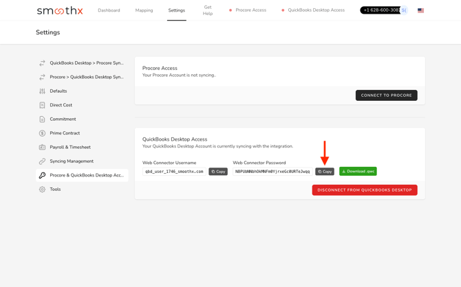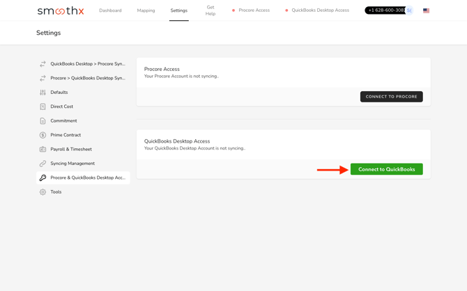 Log in to Smoothx and go to Settings → Procore & QuickBooks Desktop Access.