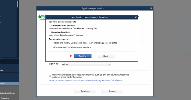 This is important. It lets Smoothx sync in the background so you don't have to keep QuickBooks open all the time. When QuickBooks asks you to confirm this choice, click Yes.