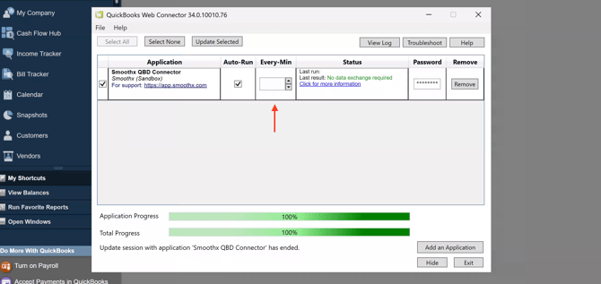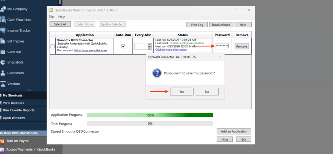 Switch back to the QuickBooks Web Connector. You'll now see Smoothx QBD Connector listed in the table. Click into the Password field for that row and paste the password you just copied.