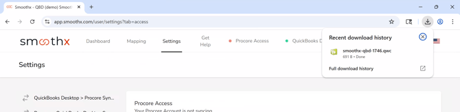 Click Download .qwc. The file will save to your computer's Downloads folder with a name like smoothx-qbd-1234.qwc.