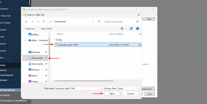 A file picker will open. Go to your Downloads folder, find the smoothx-qbd-<number>.qwc file you downloaded in Step 2, select it, and click Open.