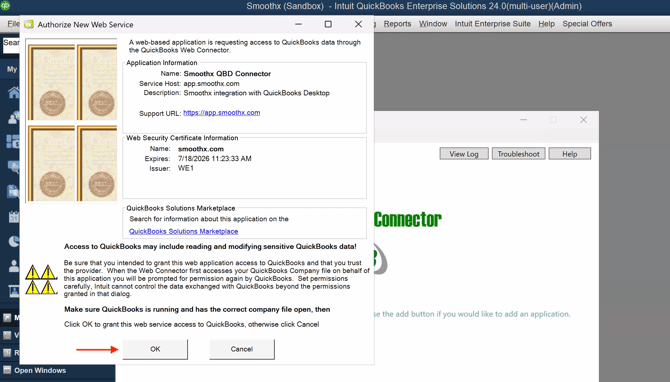 QuickBooks will show you an Authorize New Web Service window with Smoothx's details so you can confirm the integration is legitimate:
