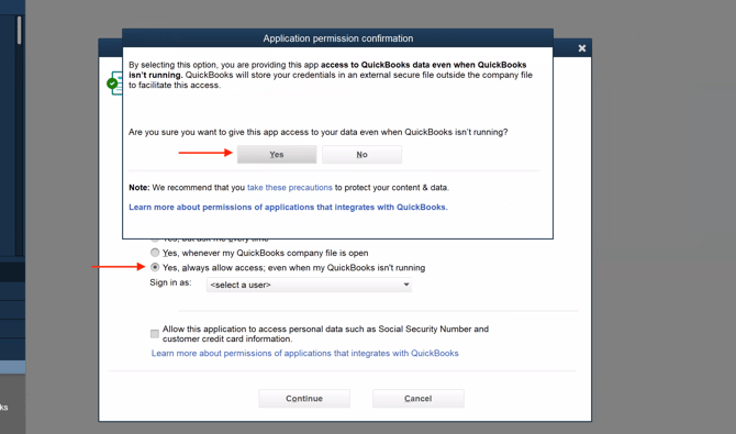 a. Choose "Yes, always allow access; even when my QuickBooks isn't running."