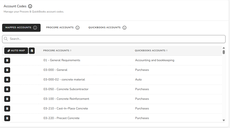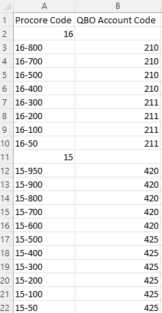 You can export Procore Costs Codes and QBO Chart of Account codes:
